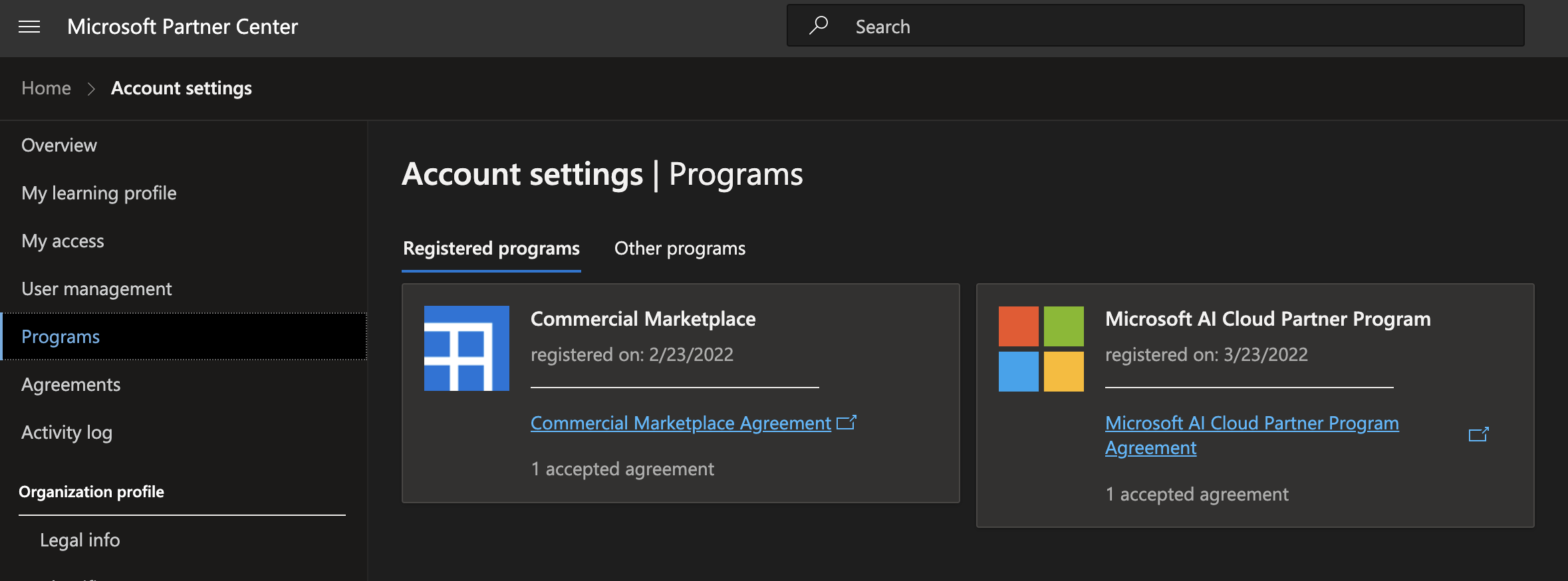 There are two programs Commercial Marketplace and Microsoft AI Cloud Partner Program to enroll before we can start the marketplace listing and offers, as shown below in Microsoft Partner Center.