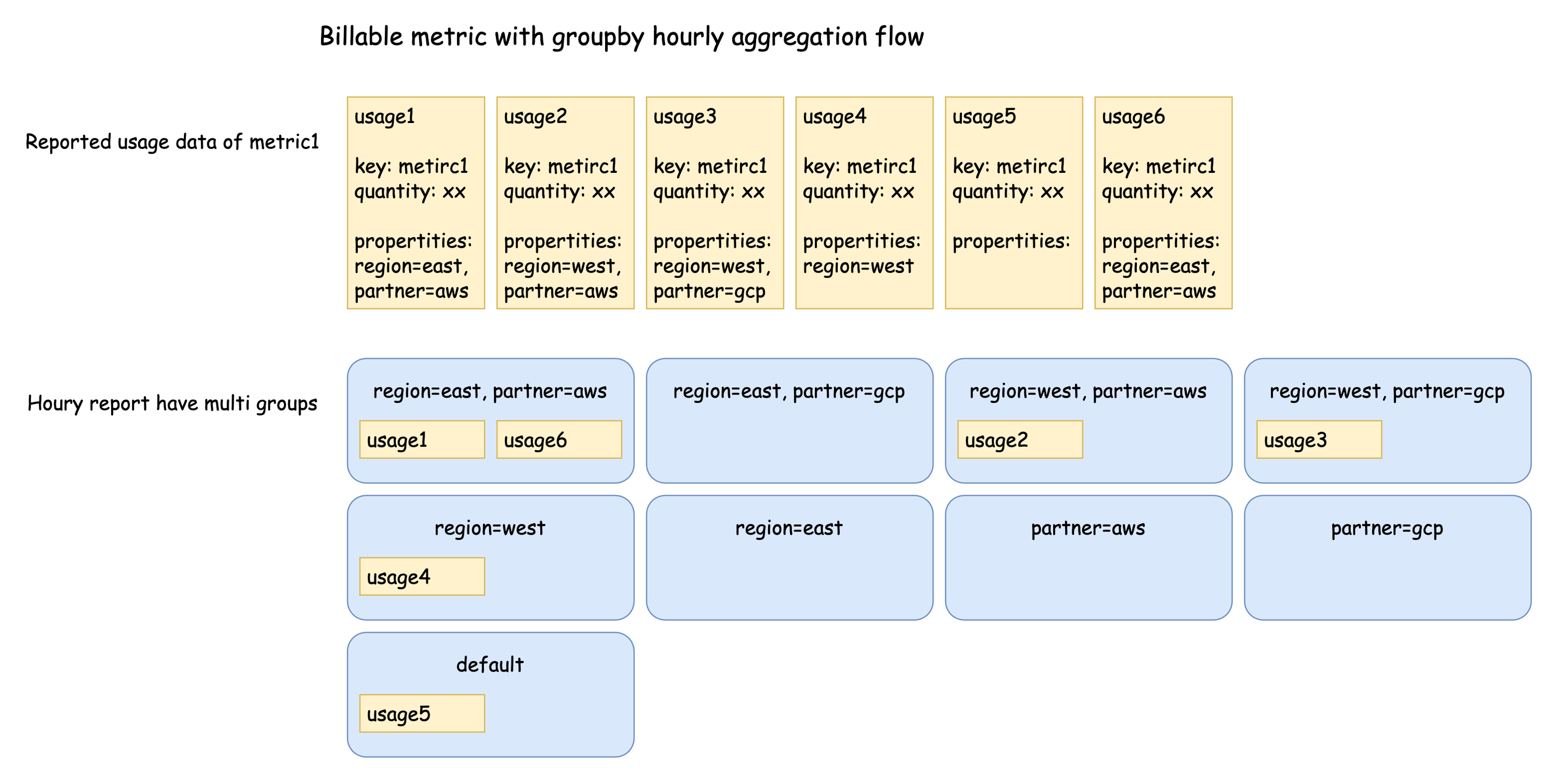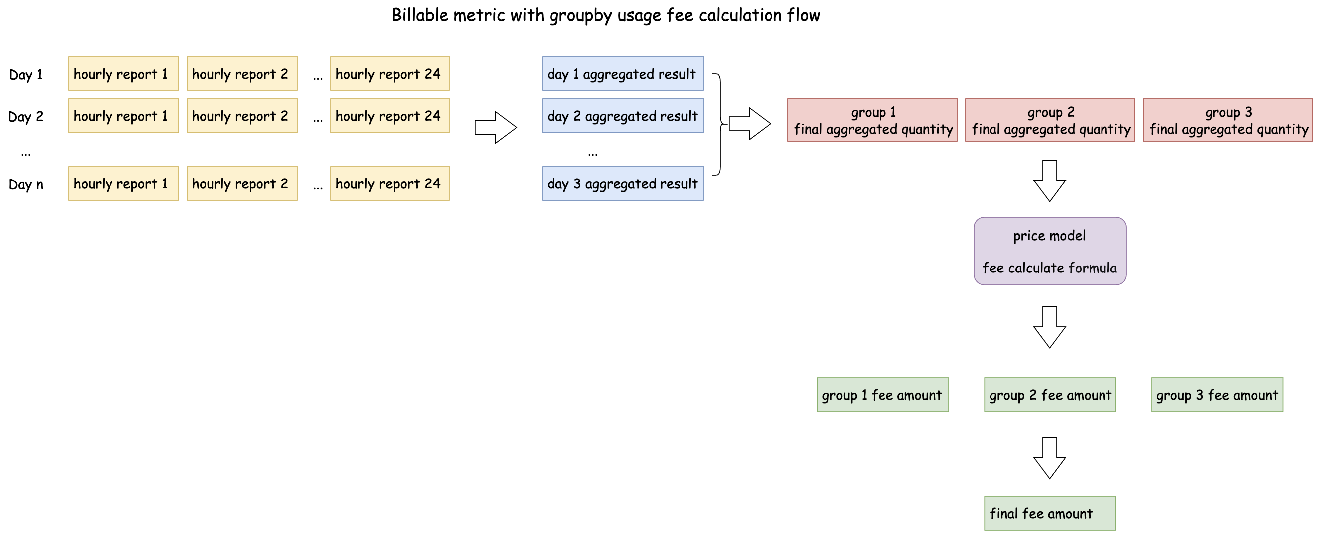 If the billable metric is configured with groupby attributes, the usage records will firstly be divided into multiple groups based on the groupby attributes, and then aggregated separately according to the aggregation type. The reason why we do this is that the billable dimension's price model will be applied to each group.