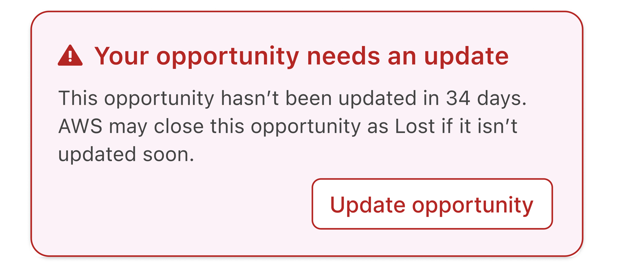 - Interaction: These often include inline CTAs like "Update Close Date". You can dismiss them for the current session, but they will reappear on your next visit if the condition persists.