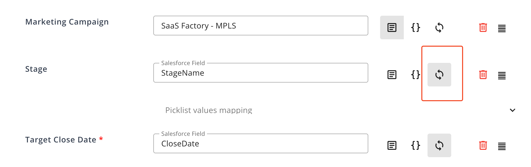 - Picklist values mapping: Use this feature to define custom value mappings between CRM and Cloud Partner fields. Refer to the related section below for details on using Picklist values mapping.