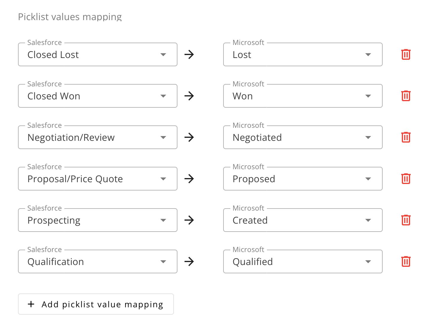 For example, the image above shows a Stage Name mapping where Salesforce stages are mapped to their corresponding Microsoft stages.