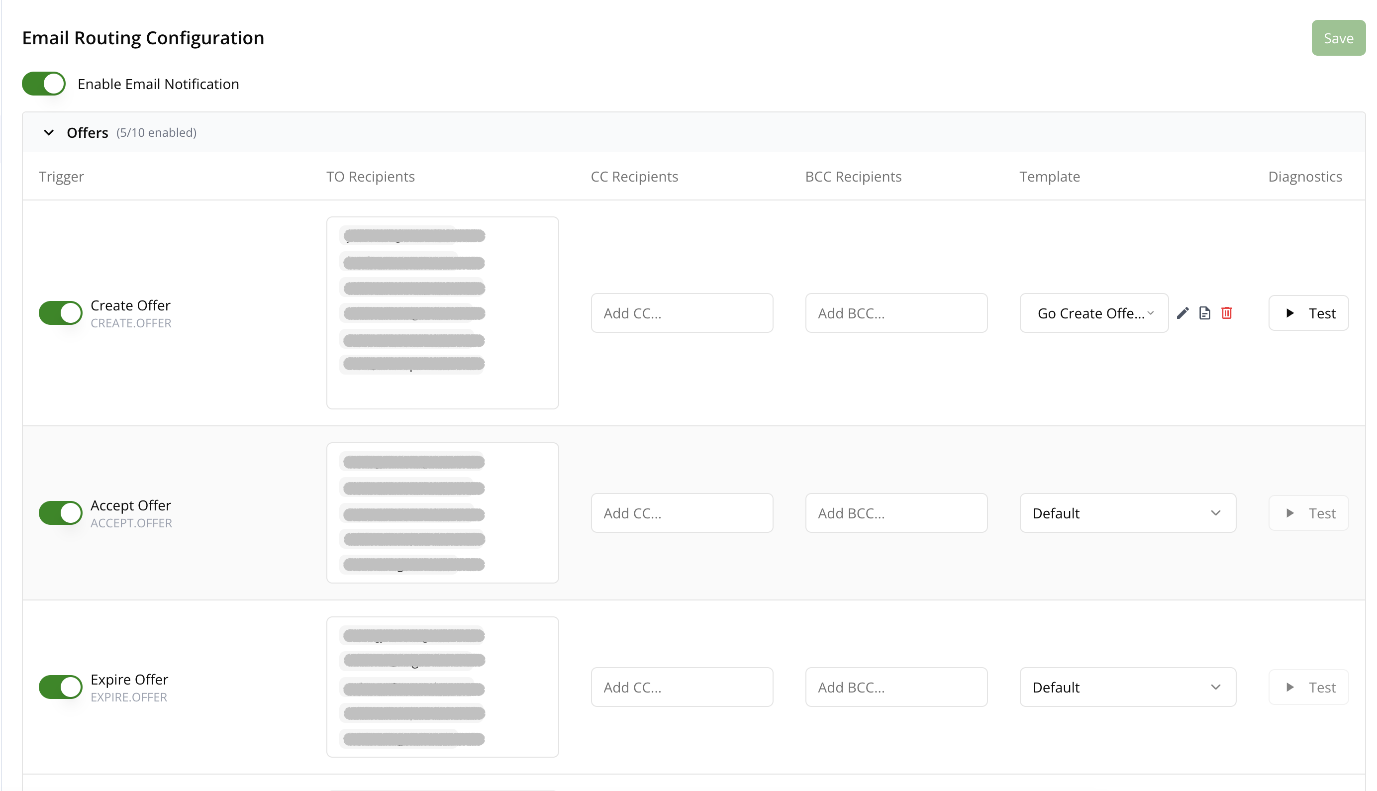 | Diagnostics | Click Test to send a test email using the assigned template (requires a template to be selected). |