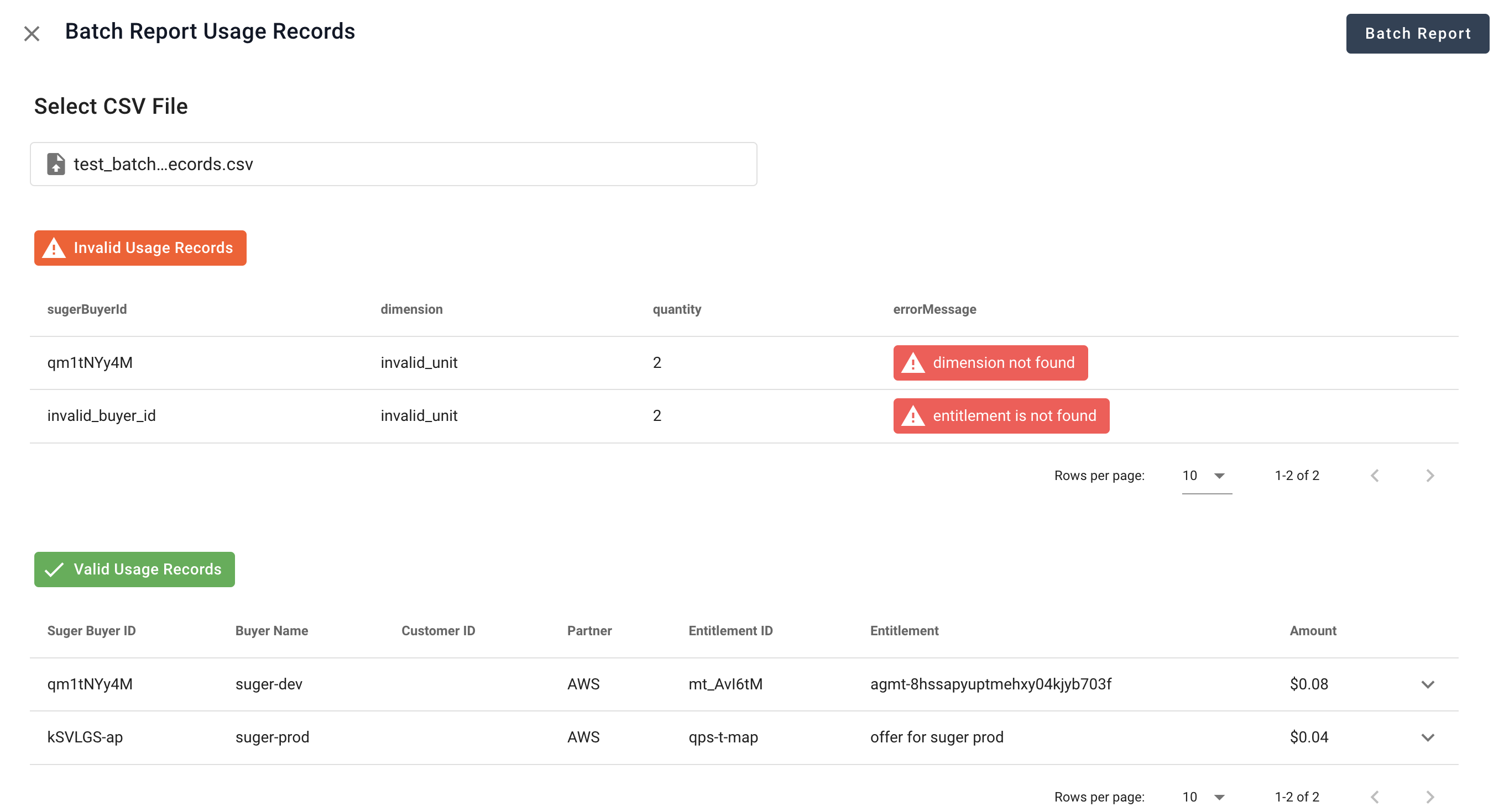 Once uploaded, Suger will validate the usage records within the CSV and highlight any invalid entries with corresponding error messages. This ensures that only valid usage records are eligible for batch reporting to Suger.