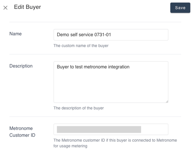 button in the Buyer and add the corresponding Metronome Customer ID. This setup only needs to be done once; afterward, Suger's service will automatically retrieve the latest billable metrics and report them to the correct Cloud Marketplace entitlements.