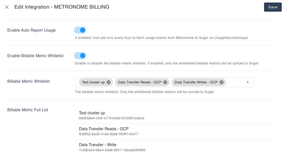 Enable Auto Report Usage. You can choose to enable or disable the automatic usage report feature for Metronome. Enabling this feature allows Suger to run an hourly cron job to retrieve the aggregated usage events from Metronome and report them as UsageRecordGroups to the Suger metering API. On the other hand, disabling this feature means that no cron job will be scheduled for this purpose.