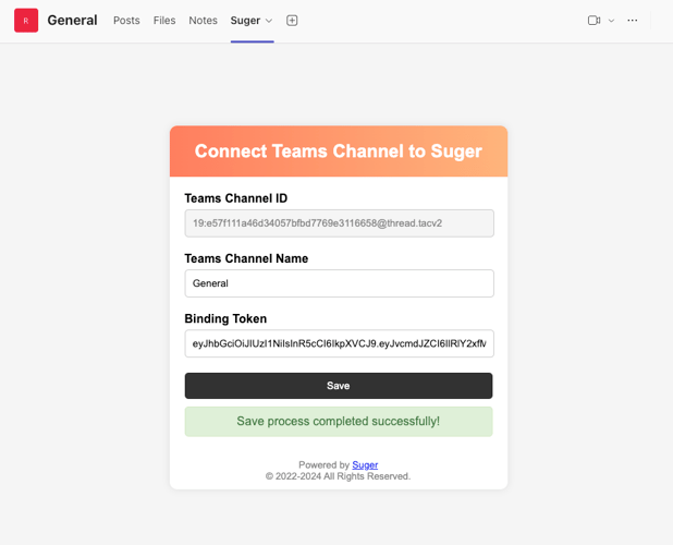 - In the Suger tab, you can change channel name as you like, and paste the Binding Token you get from Suger console. click
