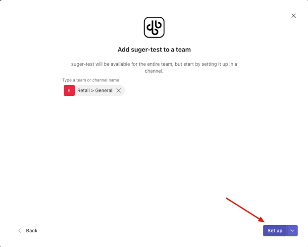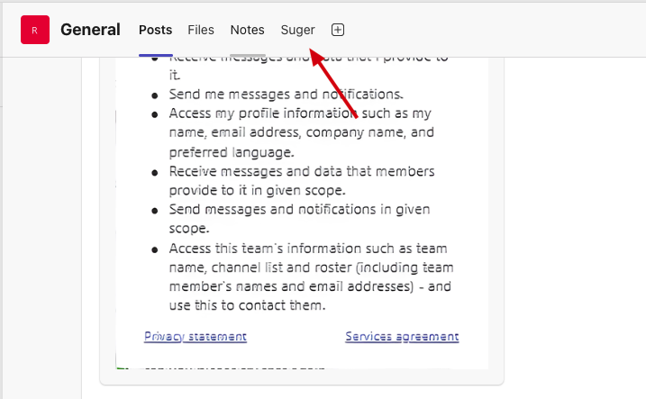 - After the app setup is completed, a new tab named Suger will appear in the channel. Click Suger tab.