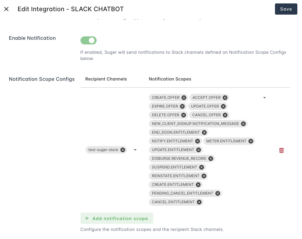 Notification Scope Configs: You can configure the notification scopes and their corresponding destination slack channels. To add a new scope, click