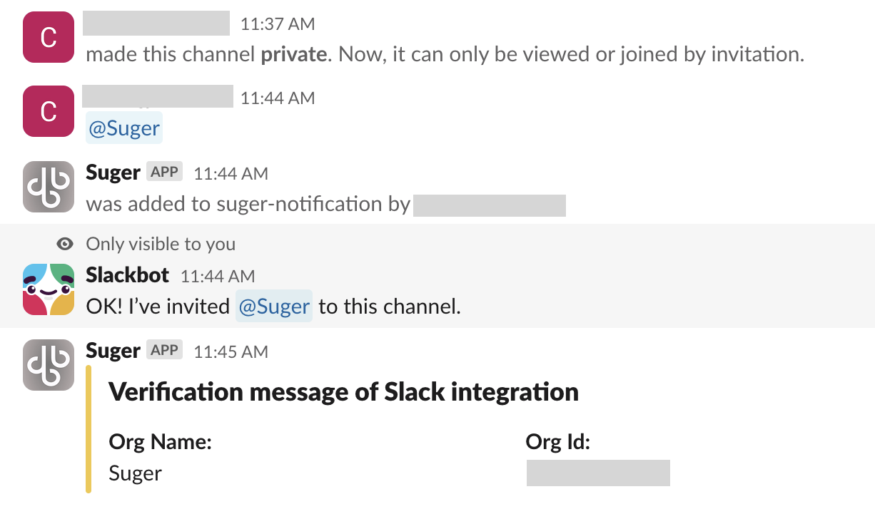 - If you choose a private channel for Suger notifications or set it to private after integrating, you must invite the